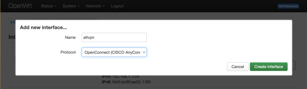 В диалоговом окне ввести желаемое имя нового VPN подключения (например, altvpn) и выбрать тип протокола OpenConnect и нажать Create interface