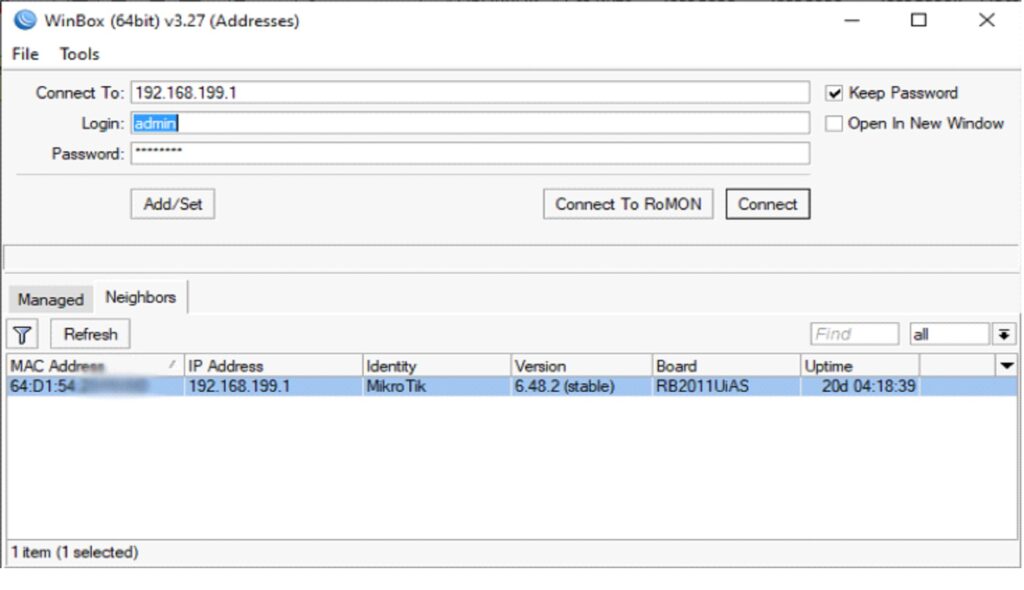 Открываем WinBox, он сразу найдет Mikrotik в вашей сети. Вводим пароль, на будущее удобно поставить Keep Password, чтобы не вводить в дальнейшем, нажимаем Connect.